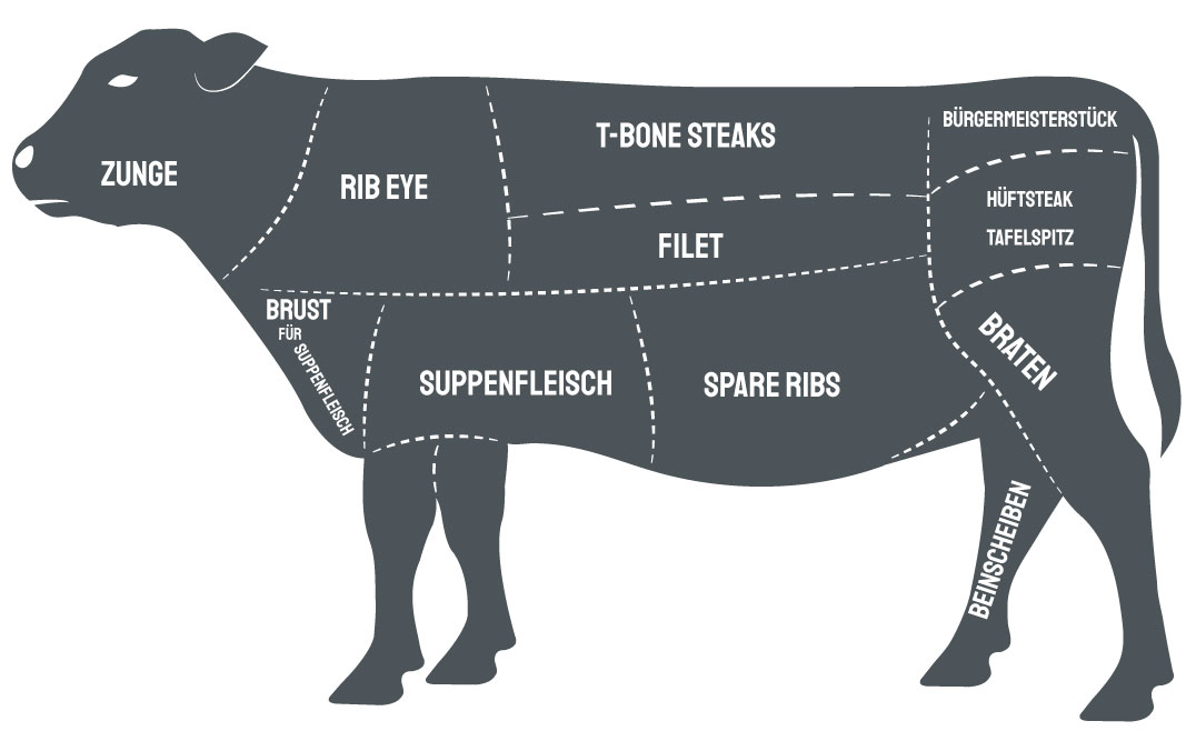 Wir bieten diverse Rindfleischpakete, die Sie direkt ab Hof kaufen können. Hier können Sie außerdem mehr über die Fütterung, Schlachtung, Reifung und Zerlegung des Rindfleisches erfahren.